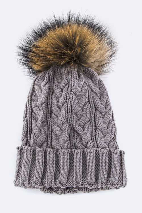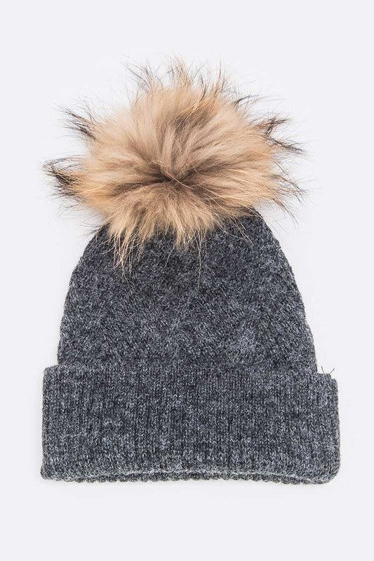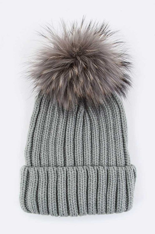 Mix Print Raccoon Fur Pom Iconic Beanie